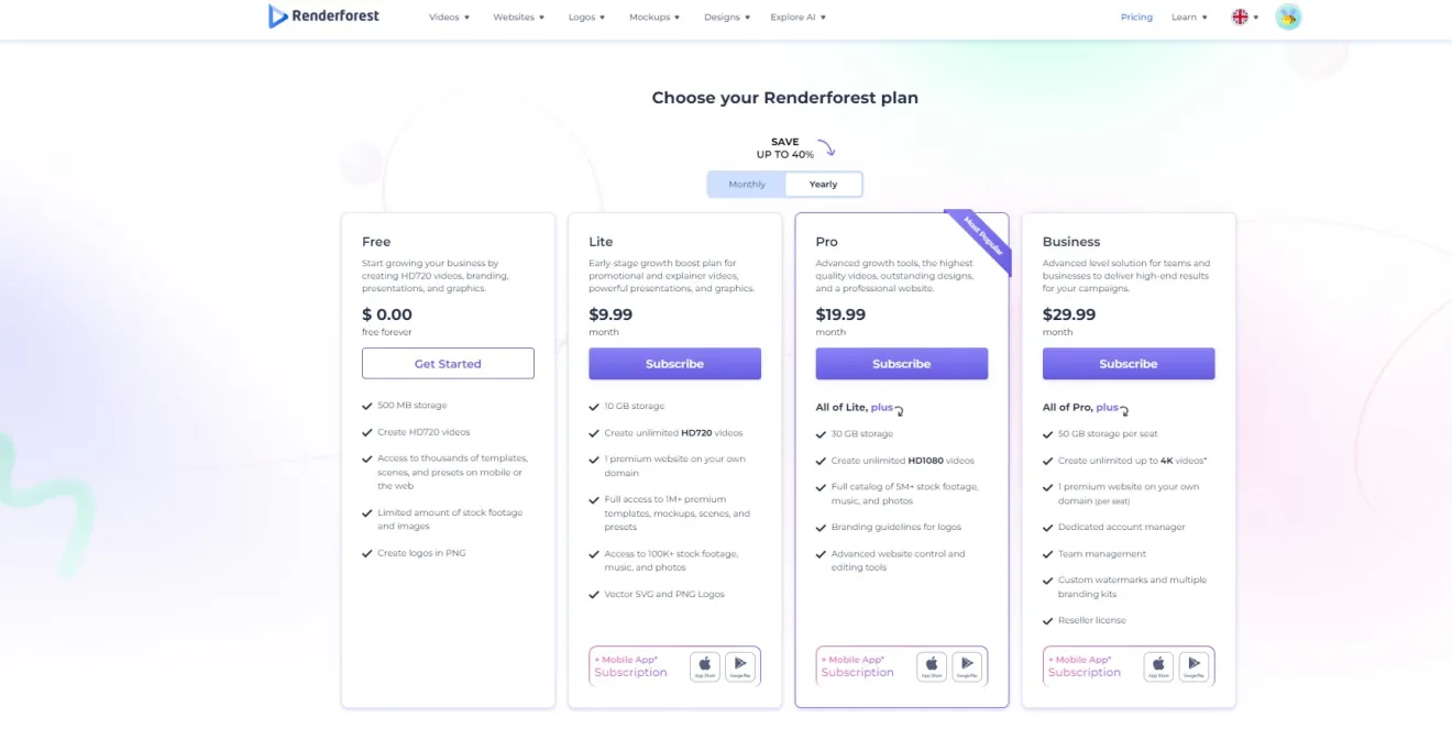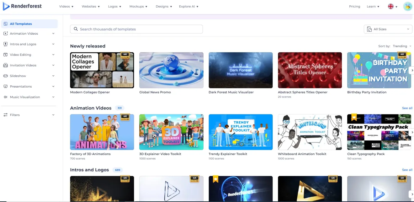 Odlikuje se bogatom ponudom gotovih predložaka za izradu videosadržaja, animacija, glazbenih vizualizatora, ilustracija, logotipa, plakata, letaka, različitih grafičkih izvora za društvene mreže te tzv. mockupove ili prototipe proizvoda, predložaka za izradu mrežnih stranica pod Renderforestovom poddomenom kao i mnoštva drugih vizualnih digitalnih sadržaja, čak i u osnovnoj besplatnoj razini računa.