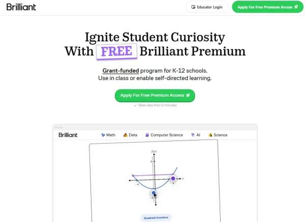Brilliant for Educators je proširena verzija platforme Brilliant.org, posebno prilagođena za nastavnike koji žele unaprijediti nastavu i podržati učenike u učionici i izvan nje. Ova verzija kombinira istraživački utemeljene metode, gamifikaciju i personalizirano učenje, omogućujući lakšu organizaciju i praćenje obrazovnog procesa. Kroz donacijama financirani program nastavnici i učenici (K–12) dobivaju besplatan pristup premium sadržaju koji se može koristiti u redovnoj nastavi ili kao dodatni materijal za samostalno učenje učenika.