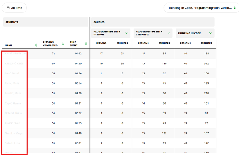 - 7. i 8. razred: Tečaj Programming with Python, kroz lekcije o funkcijama, listama i uvjetnim izrazima razvijaju dubinsko razumijevanje programerske logike u programskom jeziku Python.