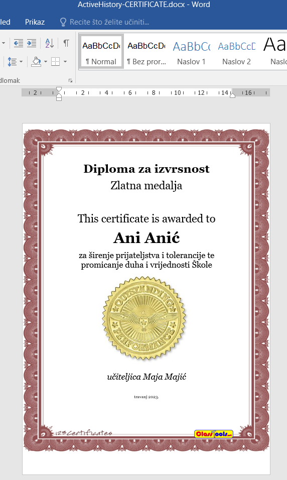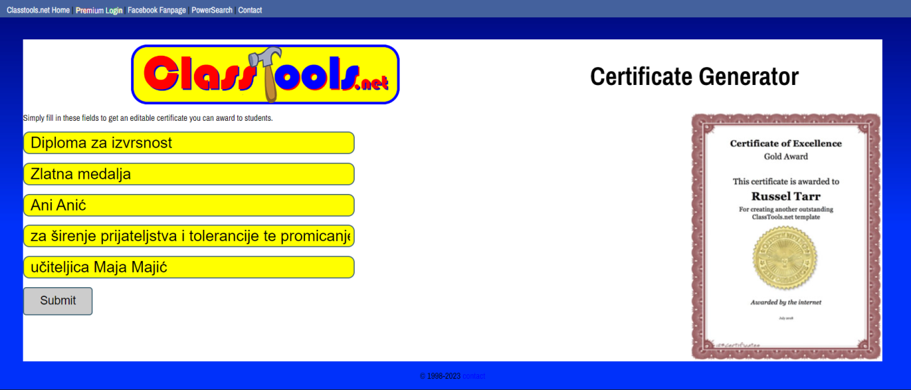 Certificate Generator je alat koji omogućuje jednostavan predložak za izradu diploma, priznanja i drugih sličnih dokumenata. Nakon što se upišu traženi podatci, alat omogućuje preuzimanje diplome u Wordu te dodatno uređivanje. Pritom se lako promijene hrvatska slova č, ć, đ, š i ž, a mogu se dodati i promijeniti i drugi dijelovi te obrisati ClassTools oznaka.