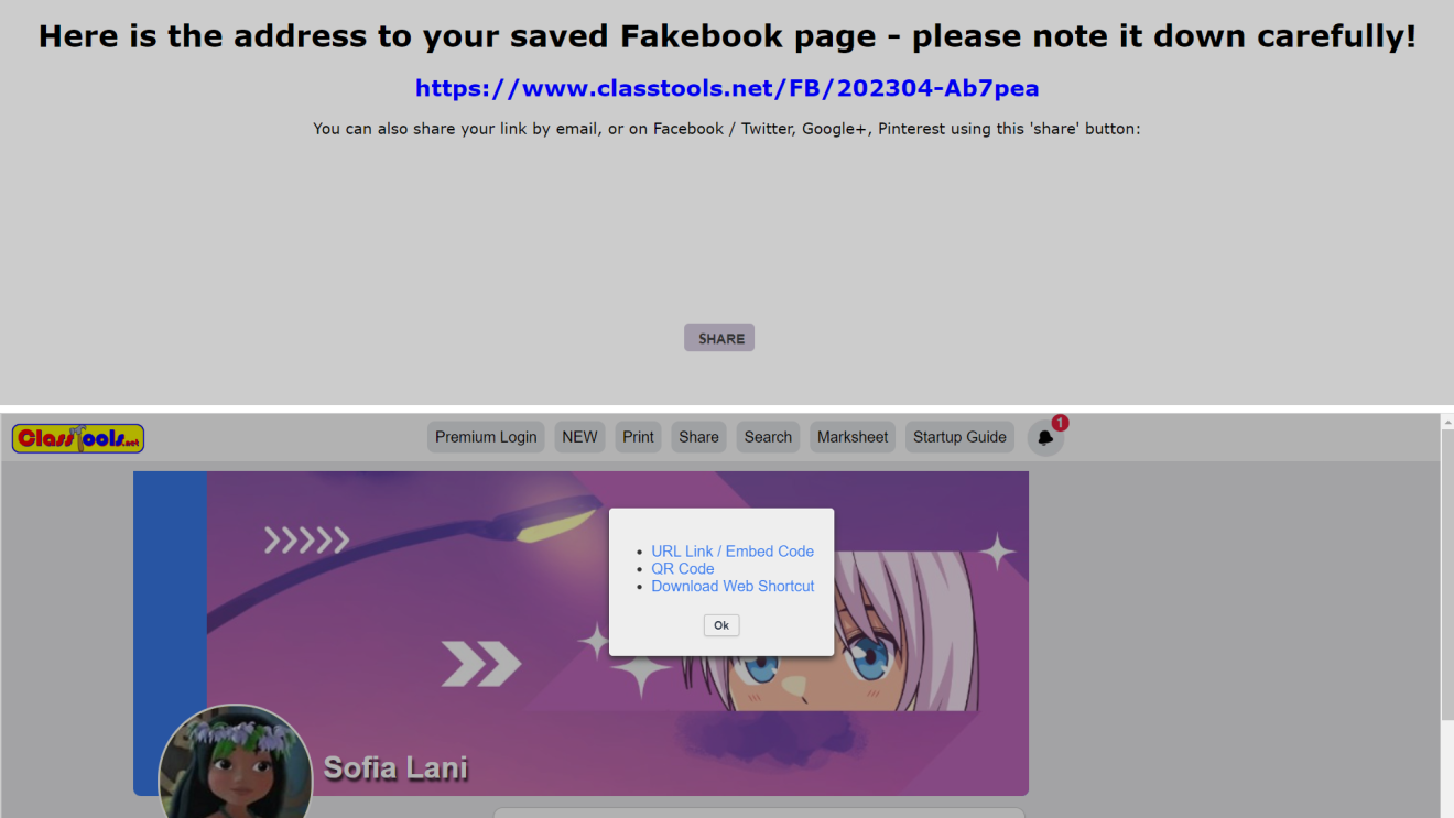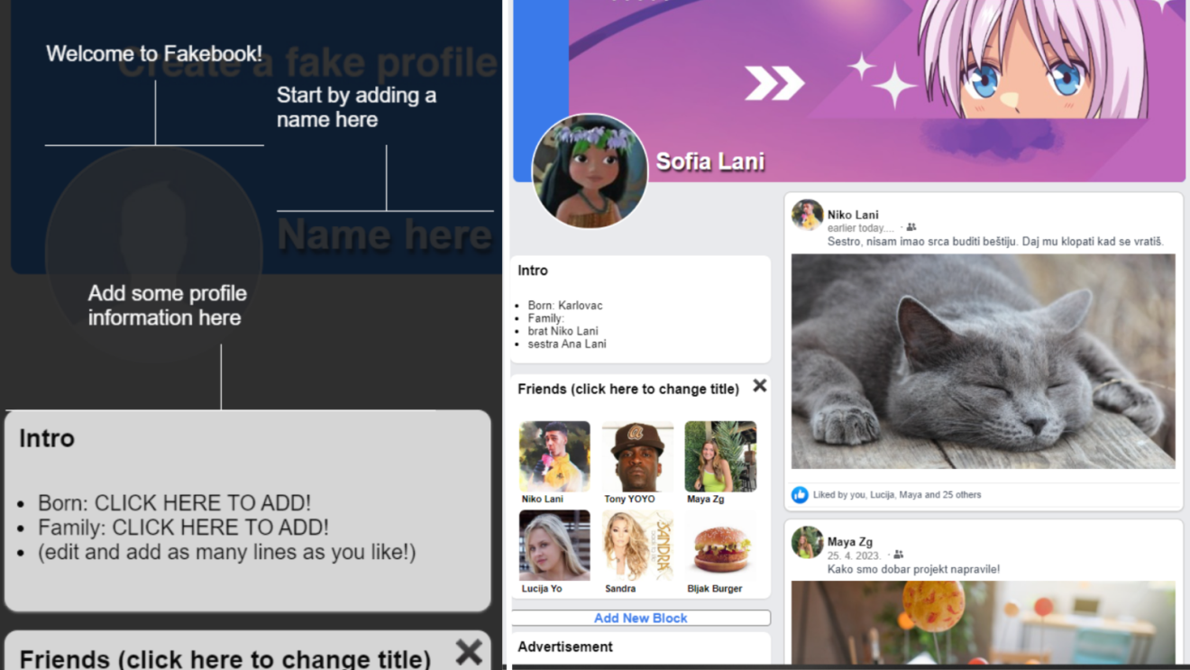 Fakebook je alat namijenjen izradi profila nalik na Facebook profil i to za potrebe učenja. Autor predlaže uporabu alata za prikaz radnje i likova iz književnih djela, za prikaz povijesnih događaja i sl., a primjeren je i za učenje o sigurnosti na internetu. Pristupom poveznici otvara se stranica na kojoj je objašnjeno sve što korisnik treba napraviti: upisati ime, dodati prijatelje, upisati postove, komentare i podatke o vlasniku stranice. Kada se unese ime i prezime osobe, alat automatski pokušava pronaći fotografiju osobe u svojoj bazi kako je ne bismo morali ručno tražiti na mreži i učitavati. Kako bismo alatu omogućili pronalazak fotografije, potrebno je izbjegavati dijakritičke znakove.