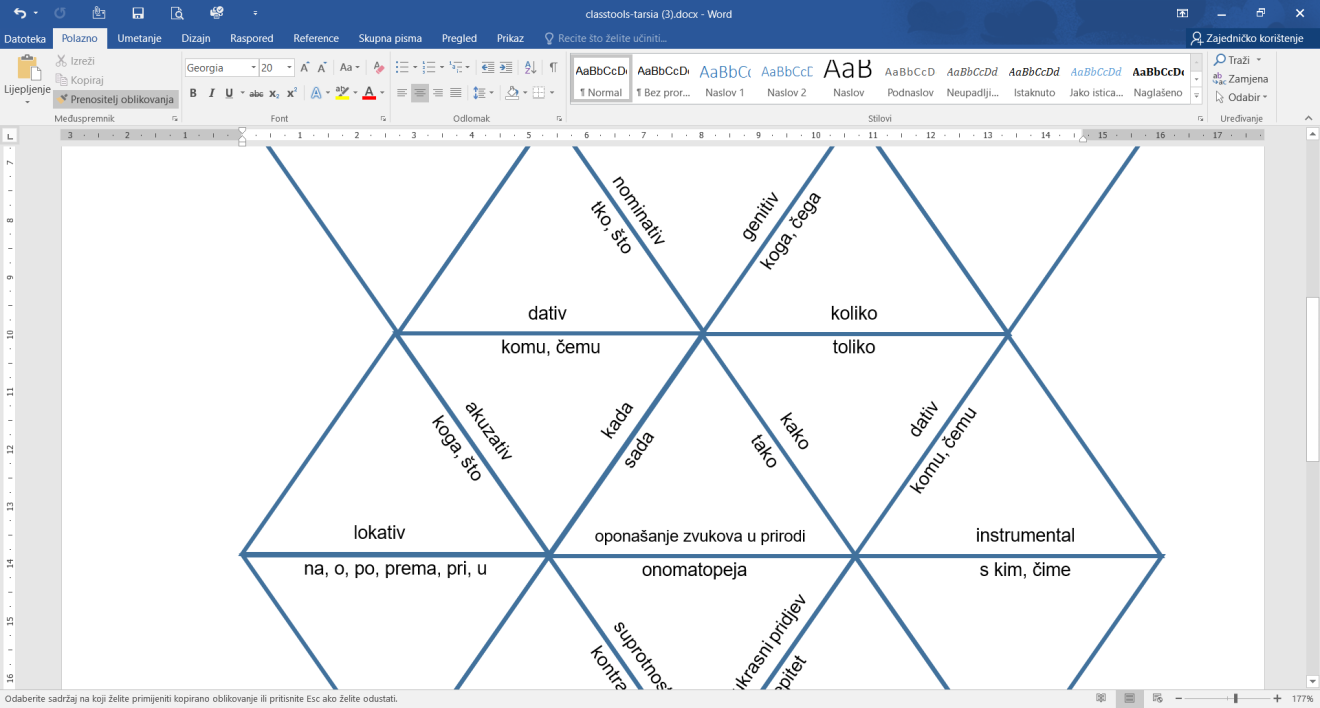 Tarsia Puzzle Generator mogućuje uvježbavanje i usustavljivanje gradiva kroz igru slagalice (puzzle). Jednostavno unesite pitanja i odgovore, a alat ih automatski generira u tarsia puzzle, odnosno slagalicu u obliku trokuta koji se može ispisati i u besplatnoj verziji. Program ne prepoznaje slova č, ć, š, ž i đ, ali nakon preuzimanja u Wordu, znakovi se jednostavno izmijene i povećaju.