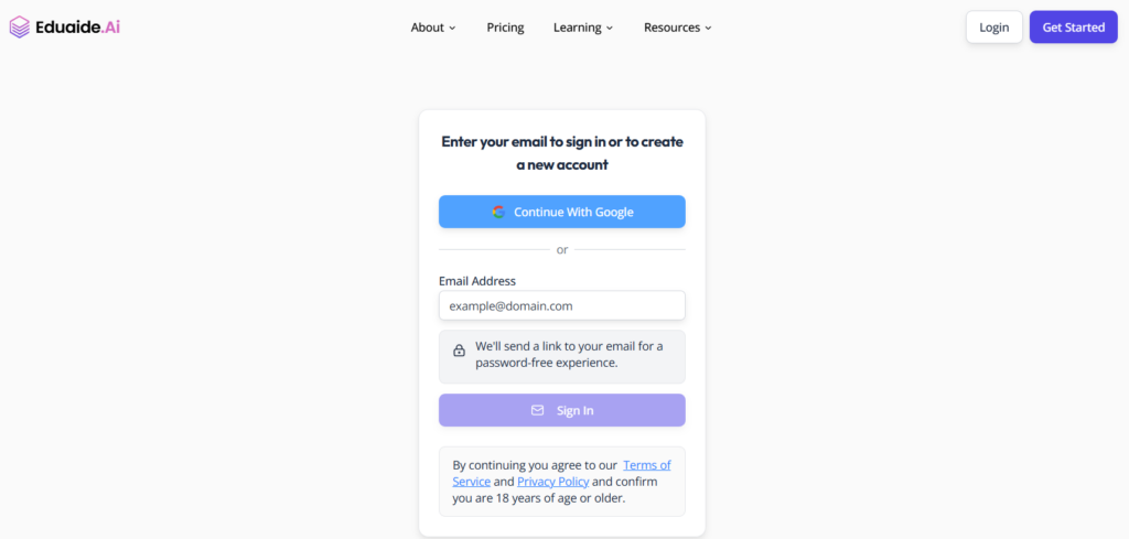 Za korištenje platforme potrebno je kreirati korisnički račun na stanici eduaide.ai. Unosom e-mail adrese korisnik dobiva verifikacijski e-mail kojim potvrđuje svoju e-mail adresu ili se jednostavno može prijaviti putem Google računa. Svi sadržaji kreirani putem platforme proizlaze iz nastavničkog računa gdje korisnik ima mogućnost preuzimanja dokumenta ili prijenosa u druge sustave (LMS, Google Workspace).
