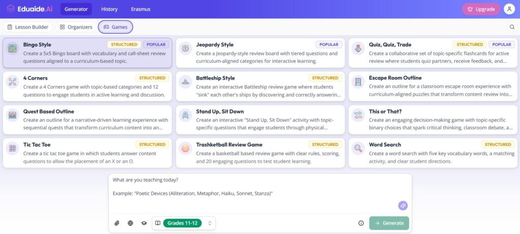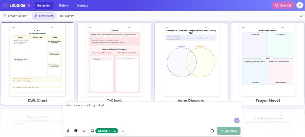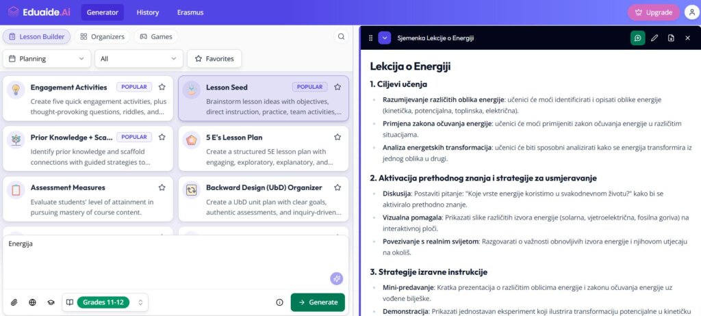Pod opcijom generator sadržaja korisnici stvaraju materijale za nastavu „Lesson Builder“. U padajućem izborniku ponuđene su opcije za izradu digitalnih sadržaja prilikom pripreme za nastavu: planiranje „Planning“, prezentacija „Presenting“, vježba „Practice“, grupna aktivnost „Group Activities“, pitanja „Questions“, procjena Assessments, povratna informacija Feedback, administracija „Administrative“. Svaka od navedenih opcija nudi korisniku na izbor kreiranje više sadržaja istog tipa. Primjerice, odabirom opcije planiranje „Planinng“, platforma nudi sedamnaest različitih sadržaja u kojima su već unaprijed integrirani različiti pedagoški modeli kao primjerice Bloomova taksonomija. Korisnik upisuje ključne pojmove ili teme te odbire razinu obrazovanja za koju je sadržaj namijenjen. Opcijom „Generate“ s desne strane otvara se kartica sa željenim sadržajem koji se može dodatno uređivati, izvesti kao Word dokument ili povezati s Google Driveom.