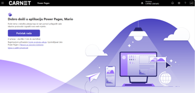 Za početak rada s MS Power Pages potrebno se prijaviti u sustav Office 365, korištenjem svog elektroničkog identiteta u sustavu AAI@EduHr. U dostupnim aplikacijama potrebno je pronaći i odabrati Power Pages, a za početak rada kliknuti na gumb „Početak rada“.