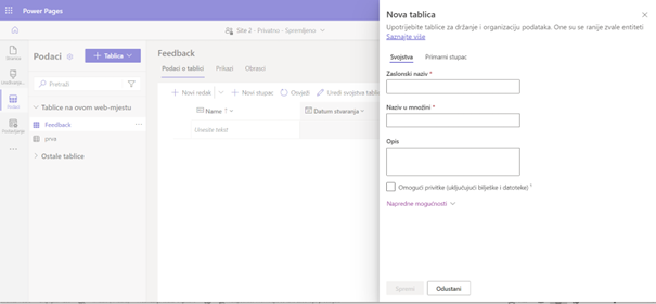 Prvi je korak izrada Dataverse tablice koja se koristi za pohranu informacija o određenim objektima. Za izradu tablice potrebno je kliknuti na gumb +Tablica, odabrati opciju „Nova tablica“, upisati naziv tablice i na kraju kliknuti na gumb "Spremi".