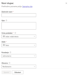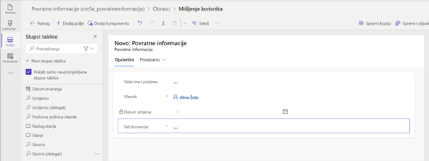 Pojavit će se Dataverse dizajner obrazaca u koji se dodaju odgovarajuća polja iz tablice. Klikom na „+ Dodaj polje“ prikazat će se popis stupaca tablice i omogućiti dodavanje u obrazac. Određena polja kao što je Vlasnik neće biti vidljiva na mrežnoj stranici. Kada su sva željena polja dodana u obrazac potrebno ga je spremiti i objaviti.