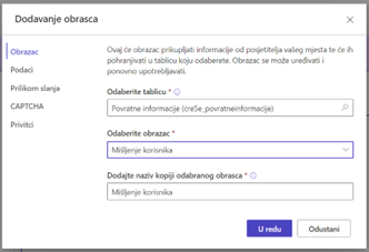 U dijaloškom okviru obrasca odaberite odgovarajuću tablicu i obrazac koji je prethodno izrađen te na kraju odaberite „U redu“.
