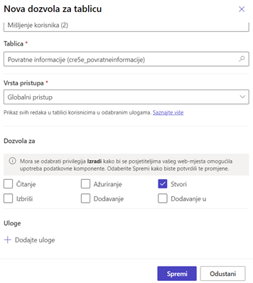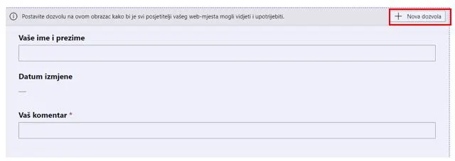 Na kraju je još potrebno urediti dopuštenja preko gumba „Dozvole“. Podesite dopuštenja za povratne informacije preko istoimenog gumba, povlastica „Stvori“ mora biti odabrana, a sve anonimne i autentificirane mrežne uloge uključene.