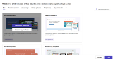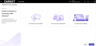Ako je odabrana opcija „Ne, nikada prije ih nisam izradio/la“ ili „Da. Već sam ranije izradio/la jednu“, omogućit će pregled i odabir predloška za izradu mrežnog sjedišta, ali i mogućnost da izrada krene od praznog predloška.