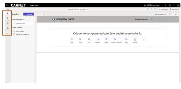 Klikom na gumb "Gotovo" Power Pages će izraditi web mjesto i otvoriti Design Studio. Design studio ima četiri radna prostora: