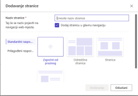 Nove mrežne stranice mrežnom mjestu dodajemo klikom na gumb +Stranica ili klikom na tri točkice desno od Početna stranica i odabirom opcije „Dodaj novu podstranicu“. Potom je potrebno upisati naziv stranice, uključiti ili isključiti opciju hoće li se stranica prikazati unutar glavne navigacije te odabrati raspored sadržaja na stranici.
