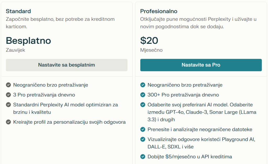 Perplexity.ai je besplatan alat za pretraživanje i interakciju s umjetnom inteligencijom, a dostupan je putem poveznice https://www.perplexity.ai/. Korisnici mogu koristiti osnovne funkcionalnosti bez ikakvih troškova, što ga čini dostupnim široj publici. Postoji i Pro verzija koja nudi dodatne značajke, kao što su veći broj upita i pristup naprednijim modelima poput GPT-4, uz mjesečnu pretplatu od 20 USD. Besplatna verzija omogućava korisnicima do pet upita s Copilot značajkom svakih četiri sata, što je ograničeno, ali i dalje korisno za osnovne potrebe pretraživanja. Moguće je i preuzeti Perplexity.ai ekstenziju za Chrome iz Chrome web-trgovine, čime se osigurava brže pretraživanje iz adresne trake preglednika.