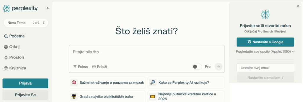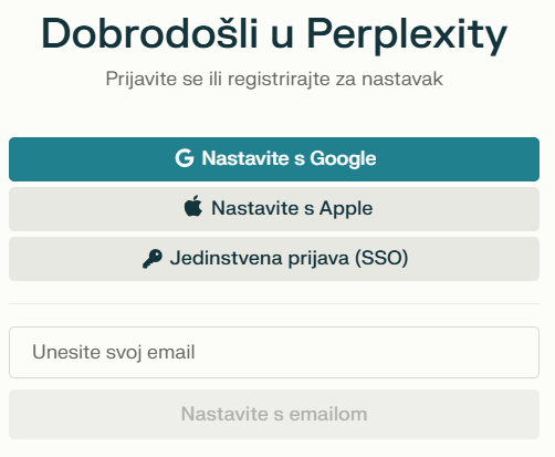 Registracija i prijava za besplatnu verziju Perplexity.ai izuzetno su jednostavne. Na početnoj stranici platforme dostupne su opcije za registraciju ili prijavu („Sign Up“ ili „Register“), koje zahtijevaju unos osnovnih informacija: e-mail adrese i lozinke. Nakon njihova unosa dovoljno je slijediti upute za potvrdu računa, i proces registracije bit će završen. Odmah nakon registracije moguće je početi koristiti besplatnu verziju za pretraživanje i postavljanje pitanja.