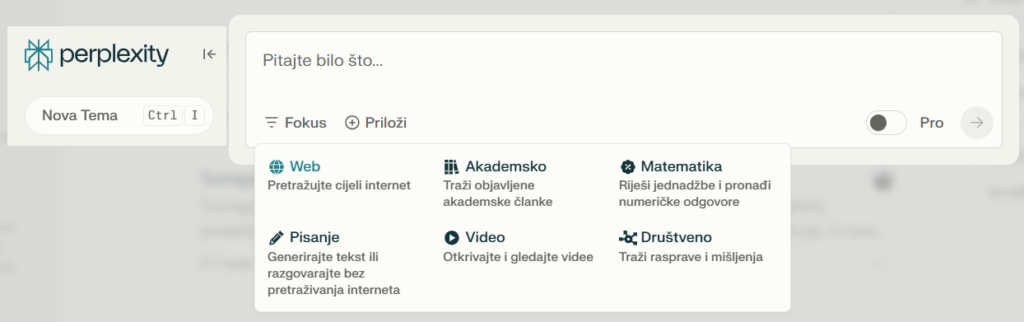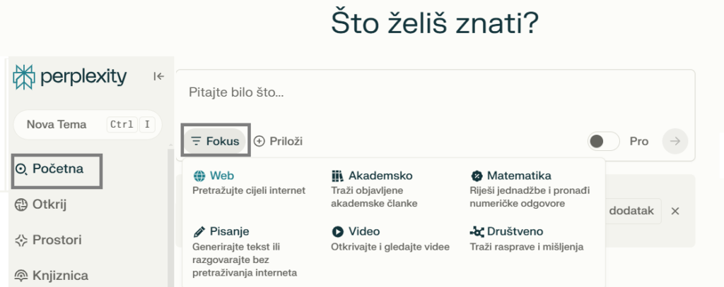 Izbornik „Početna“ predstavlja početnu stranicu aplikacije, gdje korisnici mogu započeti pretraživanje, unositi pitanja, ključne riječi za pretraživanje te vidjeti najnovije trendove i popularna pitanja koja pomažu u otkrivanju aktualnih tema. Funkcionalnost „Fokus“ omogućuje preciziranje pretraživanja prema specifičnim kategorijama. Korisnici mogu odabrati opciju „Web“ za pretraživanje cijelog interneta i dobivanje općih informacija, dok je „Akademsko“ namijenjeno traženju objavljenih akademskih članaka i istraživačkih radova. Za matematičke jednadžbe i numeričke odgovore dostupna je kategorija „Matematika“, dok opcija „Pisanje“ omogućuje generiranje teksta i interakciju bez pretraživanja interneta. Funkcionalnost „Video“ pomaže u otkrivanju i pregledavanju video sadržaja, dok „Društveno“ omogućuje fokus na rasprave, mišljenja i društvene teme. Ova široka lepeza mogućnosti omogućuje korisnicima prilagodbu pretrage vlastitim potrebama kako bi dobili relevantnije i preciznije rezultate.