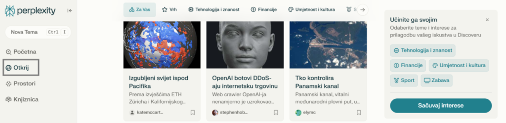 Izbornik „Otkrij“ omogućuje korisnicima istraživanje raznih tema i kategorija. Korisnici mogu pregledavati preporučene teme, članke i resurse koji su relevantni za njihove interese. „Otkrij“ također može nuditi personalizirane preporuke na temelju prethodnih pretraživanja.