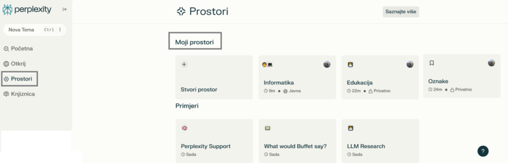 Izbornik „Prostori“ odnosi se na zajednice i specifične prostore unutar alata. Korisnici mogu pristupiti različitim grupama ili forumima gdje mogu postavljati pitanja, dijeliti informacije i komunicirati s drugim korisnicima. Prostori omogućuju interakciju i razmjenu znanja među članovima zajednice (slika 6, izbornik Prostori). Svaki korisnik može kreirati svoje osobne Prostore u koje je moguće dodavati datoteke ili poveznice na resurse, ali i pozvati druge sudionike da dodaju vlastite teme. Prostor je prvotno postavljen na privatno, a korisnik ga po želji može učiniti javnim. Opcija „+ Dodaj u prostor“ omogućuje organizaciju i upravljanje vlastitim informacijama unutar zajednica ili specifičnih tema. Ova je funkcionalnost korisna za grupiranje sličnih upita ili resursa, čime se olakšava pristup i pregled sadržaja.