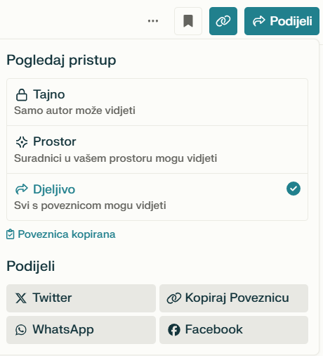 Funkcionalnost „Podijeli“ omogućuje korisnicima jednostavno dijeljenje informacija i odgovora dobivenih putem alata, uz mogućnost odabira između javnog i privatnog dijeljenja. Informacije se mogu podijeliti na društvenim platformama poput Facebooka, Twittera ili LinkedIna, čime postaju dostupne široj javnosti, ili putem e-maila i privatnih poruka, čime se osigurava da sadržaj ostane unutar zatvorenog kruga osoba. Ova opcija pruža fleksibilnost u načinu dijeljenja sadržaja, prilagođavajući se potrebama korisnika.