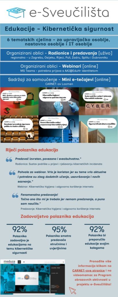 U digitalnom okruženju u kojem se svakodnevno odvijaju rad i učenje, kibernetička sigurnost postaje jedan od ključnih izazova. Iz tog je razloga u sklopu projekta „e-Sveučilišta“ izrađeno čak šest mini e-tečajeva iz tog područja. Njihov je cilj osnažiti polaznike znanjima i vještinama potrebnima za sigurnije korištenje informacijskih sustava i zaštitu podataka.