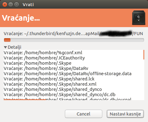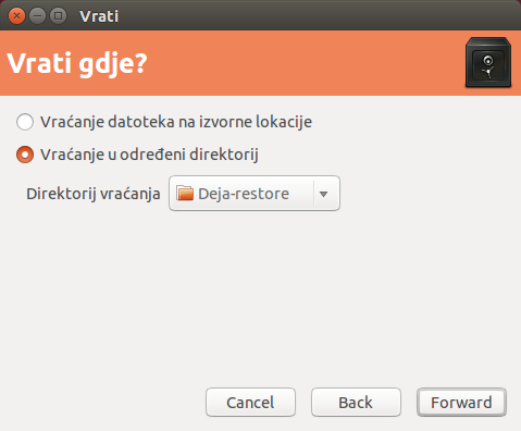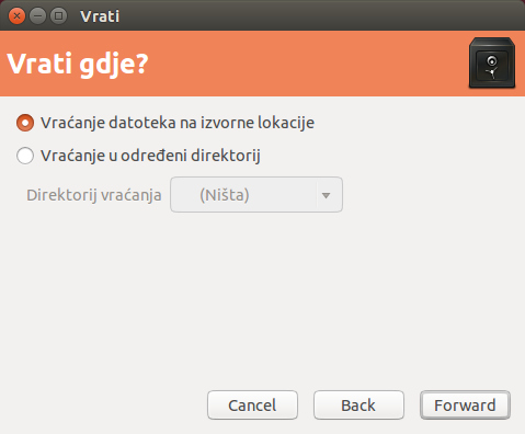 Deja dup nudi mogućnost vraćanja podataka, pri čemu se bira datum koji određuje "point-in-time". Izabrao je zadnji backup, koji se nudi po "defaultu". Program pita da li želite podatke vratiti na isto mjesto, ili na neku drugu lokaciju. Izabrao je vratiti podatke na isto mjesto. I tu počinju problemi. Naime, svaki put kad bi pokrenuo restore, računalo bi se nakon nekog vremena "izblesiralo" i vratio bi se ekran za prijavu korisnika.