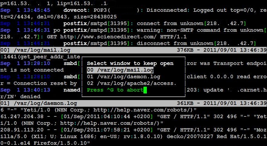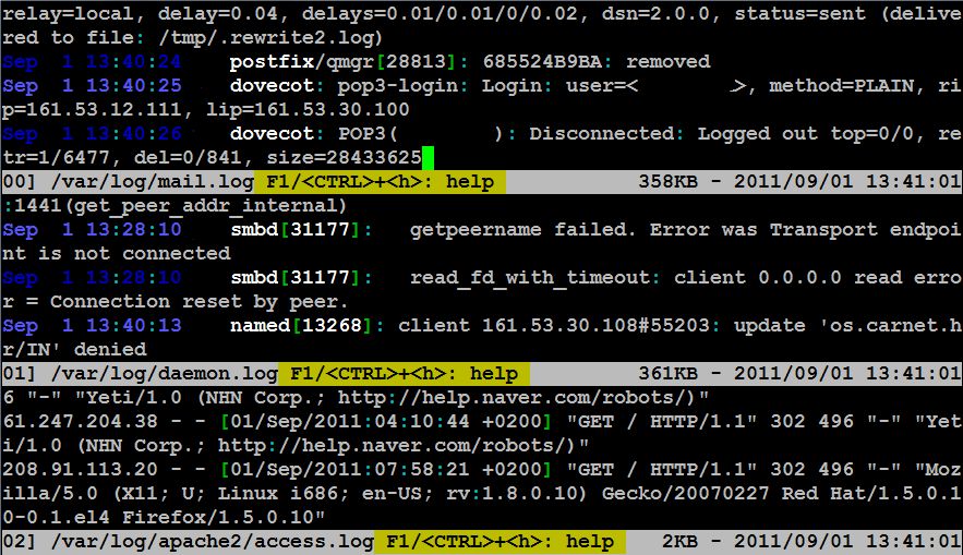 # multitail /var/log/mail.log /var/log/daemon.log /var/log/apache2/access.log