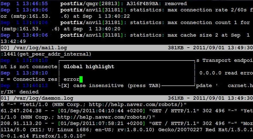 Nakon što završite, možete se vratiti u prethodni prikaz svih prozora s tipkom "U" (naravno, ovdje je riječ o kombinaciji <Shift+u>). Vizualni pregled očima nije uvijek i najbrži, zato multitail posjeduje funkciju traženja, koju možete pozvati s "/". Slično ovoj, sa kombinacijom <Shift+/>, možete dobiti highlite funkciju [1], kao na slici: