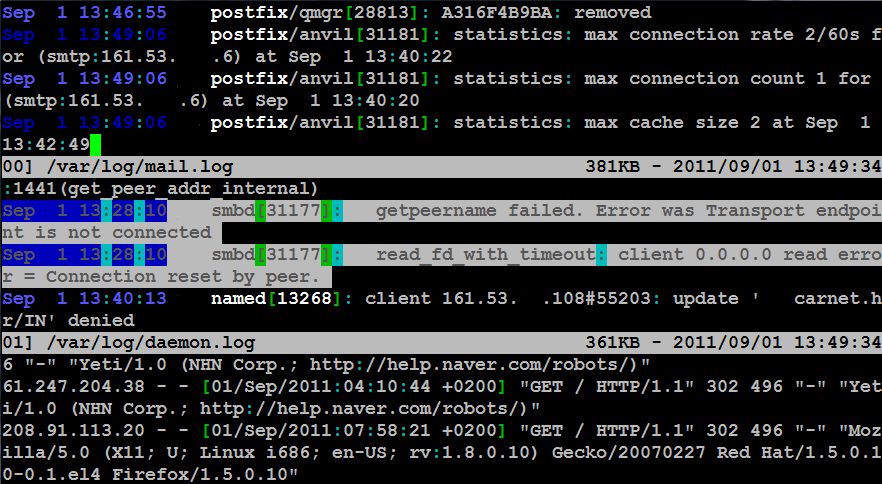 Da logove na poslužitelju treba redovito pregledavati, zna svaki sistem-inženjer. Jednostavno, bez logova bi posao sistem-inženjera bio nemoguć. Iako imamo automatizirane programe (tipa logwatch, fail2ban ili OSSEC) koji nam pomažu u detekciji potencijalnih problema (poglavito sigurnosnih), neophodno je ponekad logove pogledati "uživo". Ovdje se možemo poslužiti programima tail i less, koji mogu pratiti logove onako kako se pune, ali imamo odličan alat za praćenje više logova odjednom - multitail.