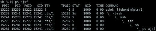 1.1 Ispis ps naredbe u BSD stilu s parametrima za prikaz stabla procesa. Korisnik je više puta pokrenuo ljusku unutar ljuske i na kraju izvršio naredbu ps ajxf. Obratite pažnju na PID i PPID identifikatore.